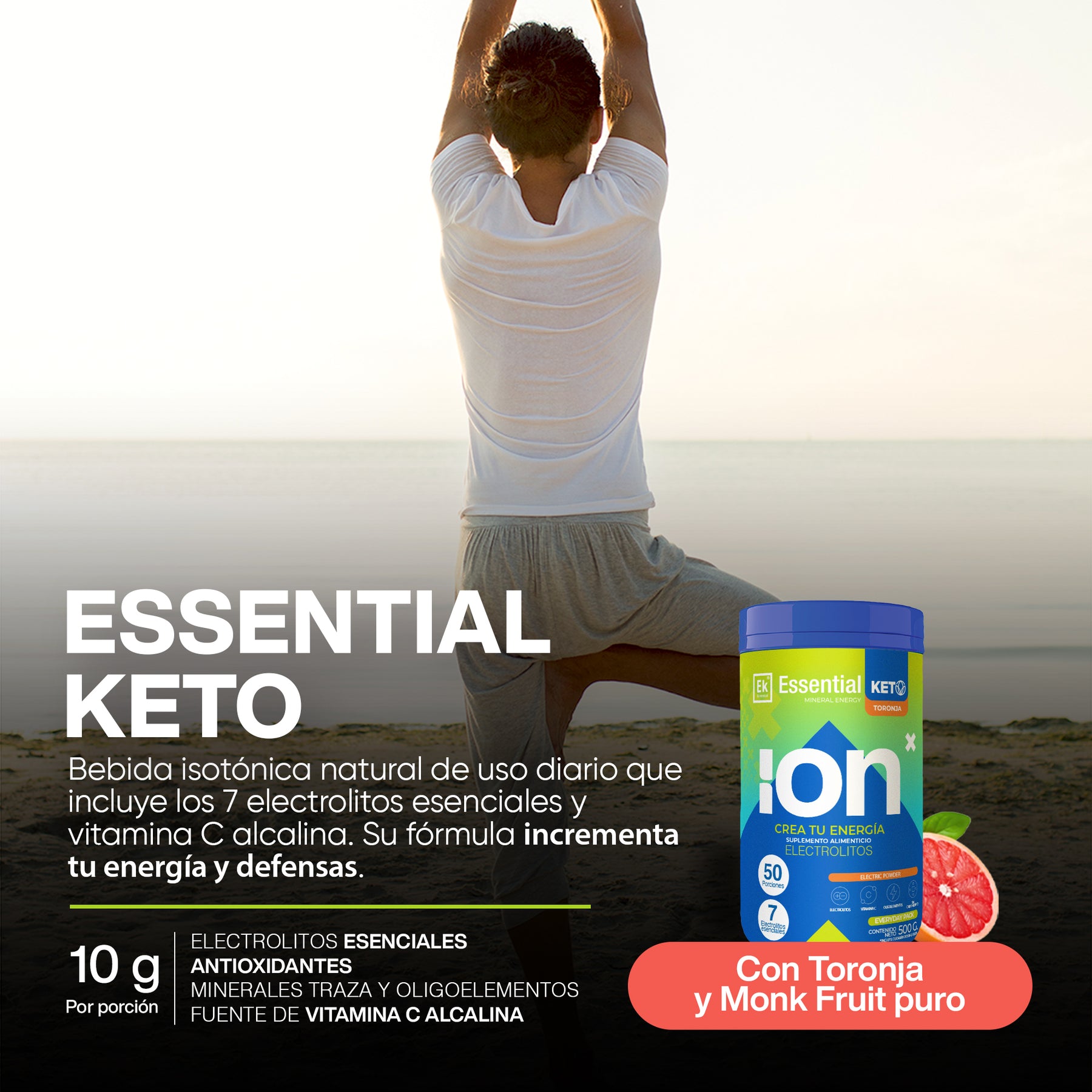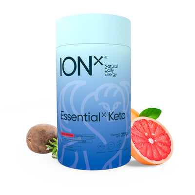 Nuestro Essential Keto de ION X es nuestra opción keto y sin azúcar para hidratarte cada día con minerales de verdad. Empezamos por lo importante: los minerales son el primer ingrediente y la mezcla incluye 7 electrolitos esenciales más vitamina C alcalina. El dulzor proviene únicamente de monk fruit 100% puro—0 calorías, 0 carbohidratos—sin edulcorantes artificiales. También es sin cafeína, sin soya, sin lácteos, sin colorantes y sin conservadores. Sabe a toronja fresca y se disuelve fácil.