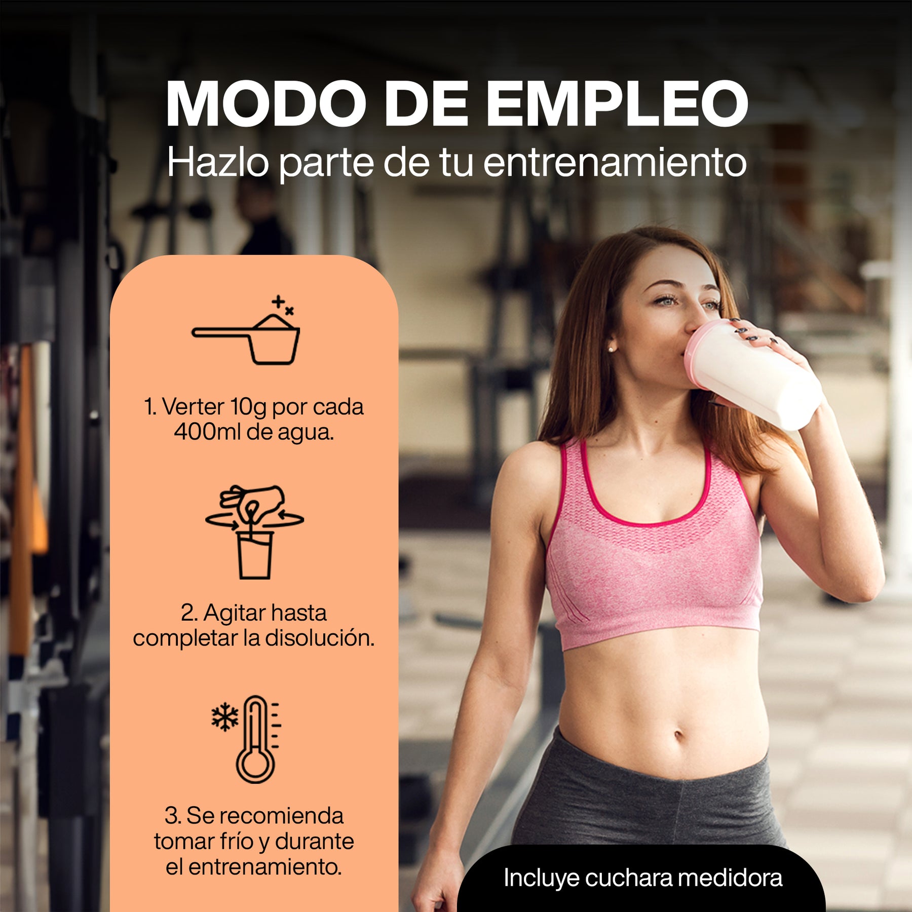 MODO DE EMPLEO | 500 g = 50 porciones de 10 g; prepara cada toma con 400 ml de agua fría. Tómalo durante tus entrenamientos!